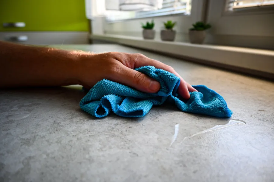 Een microvezeldoekje: top voor het schoonmaken van het aanrecht en de keukenkastjes.